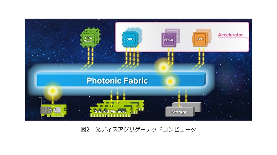 こうした課題を解決するアーキテクチャとして、図2に示すような光ディスアグリゲーテッドコンピュータを提案しています。これは、光電融合技術によってサーバ筐体の垣根を越えて計算リソースを高速・低遅延に接続し、まるで1つの大きなコンピュータのように扱える仕組みです(3)。