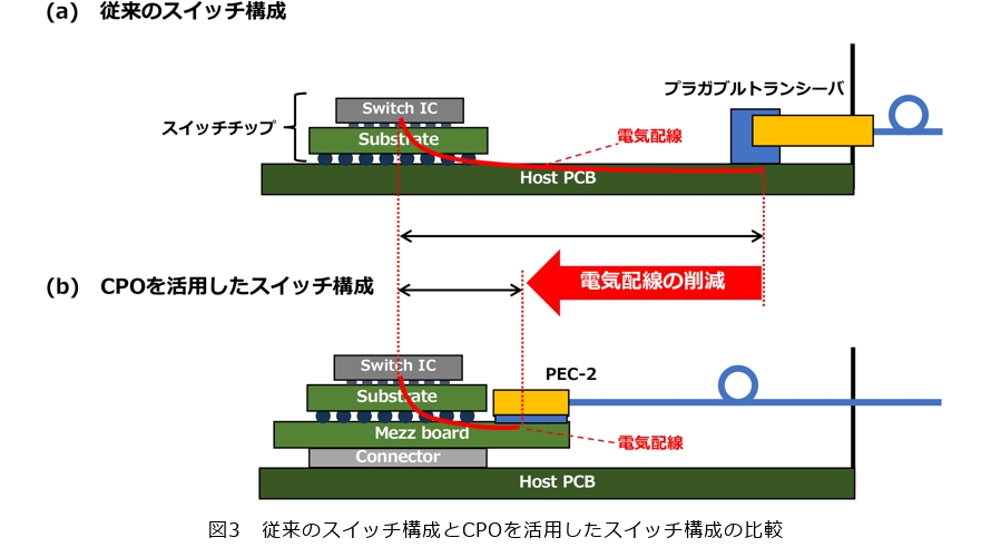 図3に従来のスイッチ構成とCPOを活用したスイッチ構成の比較を示します。従来のスイッチ構成では、フロントパネルにプラガブル型トランシーバを装着する構造が主流であり、スイッチチップからトランシーバまでの電気配線で大きな電力を消費するため高速化の妨げとなっていました。