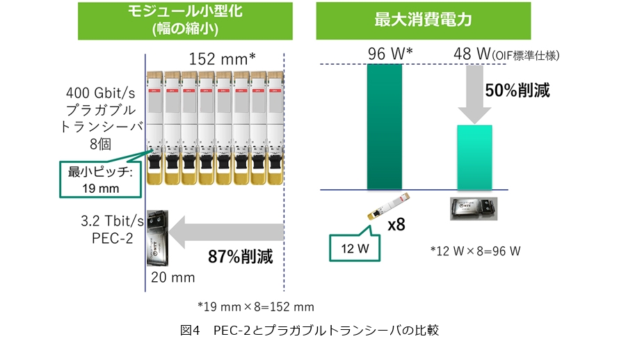 図4にPEC-2と同等の帯域を実現するために必要な従来のプラガブルトランシーバとの比較を示します。PEC-2は1台で3.2Tbit/sの帯域を持つため、400 Gのプラガブルトランシーバ8台分に相当します。モジュールの大きさを比較すると、PEC-2によって87%の削減が可能となります。また、PEC-2はOIF規格で定められた消費電力の最大値を満たすため、消費電力12 Wの従来プラガブルトランシーバ8台分に比べて、50%削減した48 Wで実現可能となります。