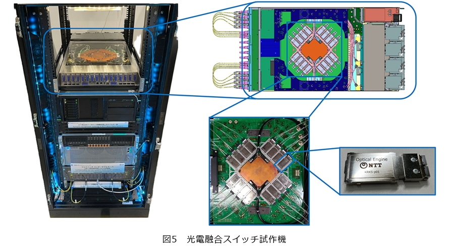 今回このPEC-2を搭載した「光電融合スイッチ」の試作機を作製しました。51.2Tbit/sのスループットを持つスイッチチップ近傍にPEC-2を実装することで、イーサネットフレームを転送するスイッチ装置が実現できました。図5に示すようにNTTはこのスイッチを19インチラックに収容できるサイズで試作し、空冷に加え水冷を取り入れた効率的な冷却設計によって、高発熱のスイッチチップやPEC-2を安定動作させています。