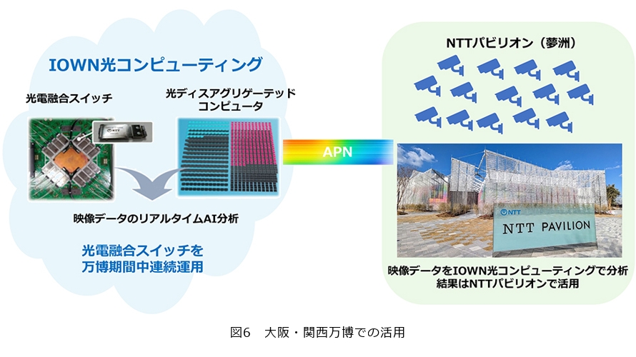 2025年4月13日から10月13日にかけて開催された大阪・関西万博において、NTTはパビリオンを出展しその中でIOWN光コンピューティングとして、光ディスアグリゲーテッドコンピュータのアーキテクチャを採用したコンピューティングによるサービスを提供しました(図6)。会場内に設置された多数のカメラ映像をリアルタイムでAI分析し、その結果をパビリオンの展示に活用するという取り組みです。万博に関する内容については、本特集記事『IOWN 2.0時代の社会実装に向けた取り組み』に詳細が説明されています。