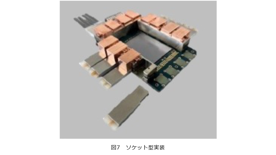 万博に活用した光電融合スイッチ試作機は、OIF規格に準拠したCPO構成を活用しましたが、商用化に向けてさらなる高性能化を実現すべく研究開発を進めています。従来のイーサネットスイッチでは光トランシーバを装置のフロントパネルにて挿抜するプラガブルトランシーバを採用していたため、ユーザの手で交換できることから故障時の修理が容易でした。一方でCPO構成では、従来の光トランシーバに相当するPEC-2が装置内部のスイッチチップ近傍に半田付けで実装されているため、交換が容易ではありません。メンテナンスに際して装置を停止し、分解したうえでのデバイス交換が必要なため、修理コスト・運用コストがかかります。そこでNTTイノベーティブデバイスではCPO構成としてスイッチチップに直接実装できる形態をとりながら、プラガブルトランシーバのように付け外しができる実装形態(ソケット型実装)を提案し、実用化を進めています(図7)。さらに基本特性である通信容量の拡大と大幅な消費電力の低減を進めており、6.4Tbit/sのPEC-2を実現し102.4Tbit/sのスイッチチップに実装することで、従来のプラガブルトランシーバを使用したスイッチ装置と比較して50%の電力削減を実現すべく開発に取り組んでいます。