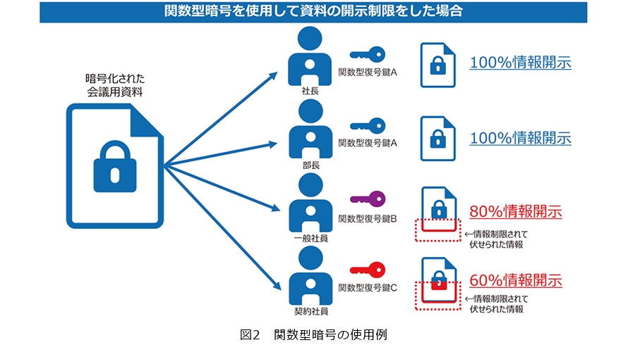 ところで、現在の暗号技術でできることについても、1例を挙げておきましょう。現在は従来の「1対1」の通信ではなく、クラウド環境でみられるような「1対多」、あるいは「多対多」の通信が頻繁に行われるようになっています。複数人で行われるオンライン会議などがその例といえますが、こうした「1対多」「多対多」の通信の際、各参加者に渡す情報を同じものにできない場合があり、「1対1」の通信に対応した通常の暗号では不十分なケースが起こり得ます。例えば、ある企業内で重役から一般社員まで、立場や役職の異なる参加者による“企業秘密を含む”重要な社内会議がオンラインで行われたとします。すべての参加者に“暗号化された同じ会議用資料データ”を配布し、役職に応じて異なる復号鍵を渡すことで、情報開示を細かく制御できます。具体的には、部長以上の管理職にはすべて内容を復号できる鍵を、それ以外の社員には機密情報が複号されない制限付きの鍵を付与することで、秘匿したい情報を隠すことが可能になります(図2)。