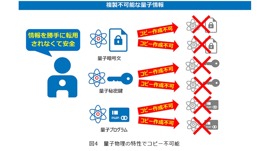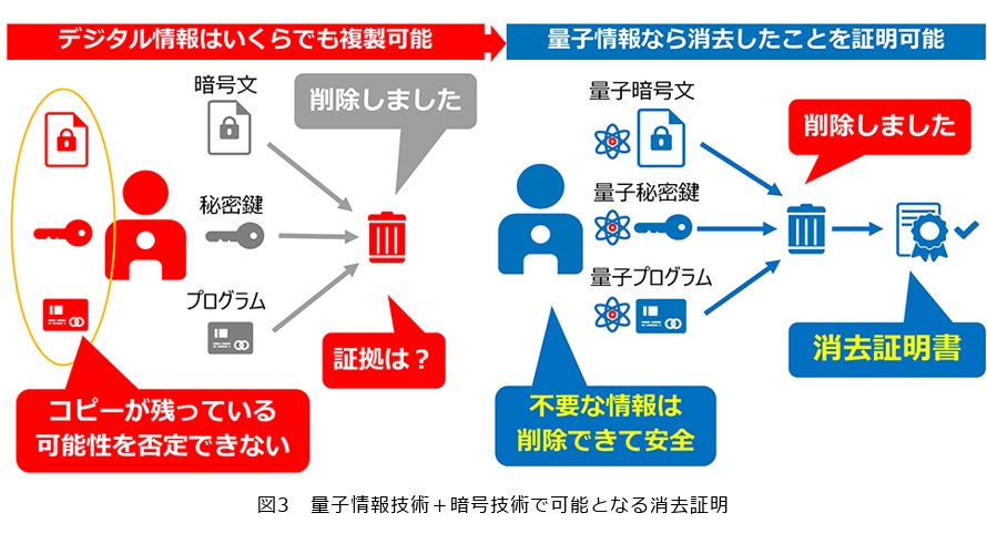 しかし、量子情報技術を利用すると、この状況は一変します。あくまで量子コンピュータの存在が前提となりますが、量子状態の暗号文や秘密鍵(復号鍵)を生成することで、量子の特性を利用した完全な「消去証明」の可能な復号鍵や暗号文が実現できるようになります(図3)。