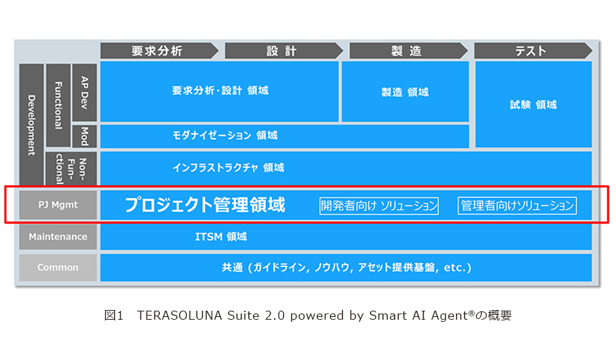 本誌2025年7月号「挑戦する研究開発者たち」正野勇嗣のインタビューでは、Smart AgentをNTTデータグループの取り組みとして掲げ、今後積極的に展開していく旨の話をさせていただきました。その後、このSmart AgentはNTTデータグループがめざす「AIエージェント」の世界観、コンセプトとして、Smart AI Agent®*1として商標化されました。そのような中、私は現在このSmart AI Agent®のプロジェクト管理分野を所掌しています。当社には、システム開発に必要な、開発手順・フレームワーク・開発支援ツールをパッケージ化したTERASOLUNA®*2という総合ソリューションがあります。現在、TERASOLUNA Suite 2.0 powered by Smart AI Agent®として、こちらのAI化に取り組んでおり、私の活動もその1つに位置付けられています(図1)。