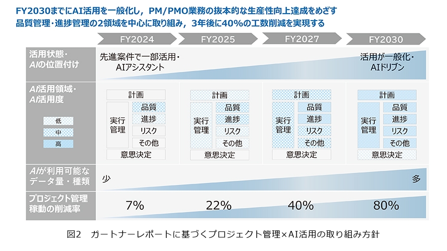 一般的に、開発業務におけるプロジェクト管理が占める割合は、バグの報告等、開発者の管理にかかわる作業も含めると2割弱といわれていますが、私たちはガートナーのレポート、すなわち「2030年までにプロジェクト管理タスクの80%がAIで代替される」という予測に着目し、自社のプロジェクト管理システムへいち早くAIを搭載していく方向へと舵を切りました。そういった流れで上述の2030年の80%達成に向けたロードマップを策定し、まずは2027年に40%のマイルストーン達成に向けた取り組みを開始しました(図2)。