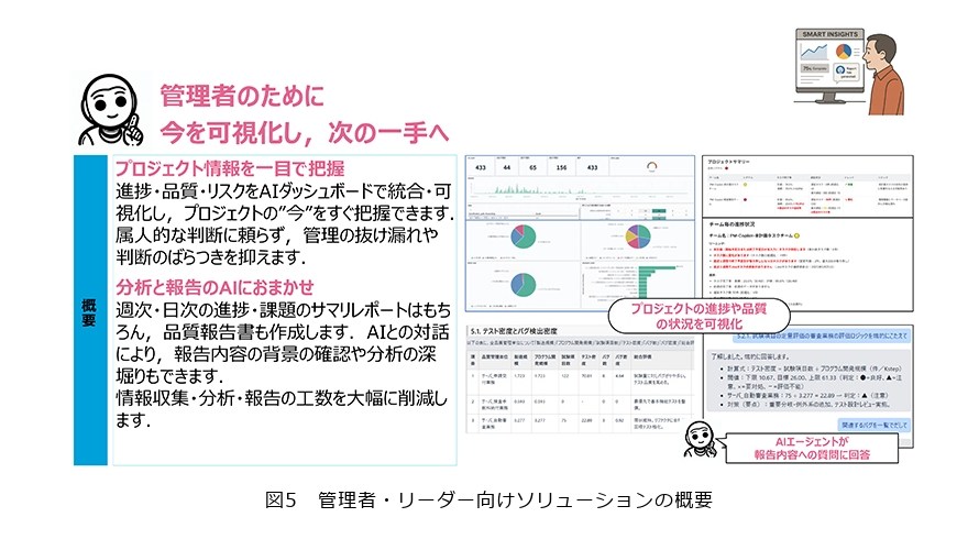 次に「管理者・リーダー向けのソリューション」について説明します。このソリューションは「開発者向けのソリューション」を用いて登録されたタスクの情報やバグの情報を自動的に収集し、開発プロジェクトの進捗やプロダクトの品質について、AIの力を借りて重要な点の把握とその後の意思決定をサポートします(図5)。