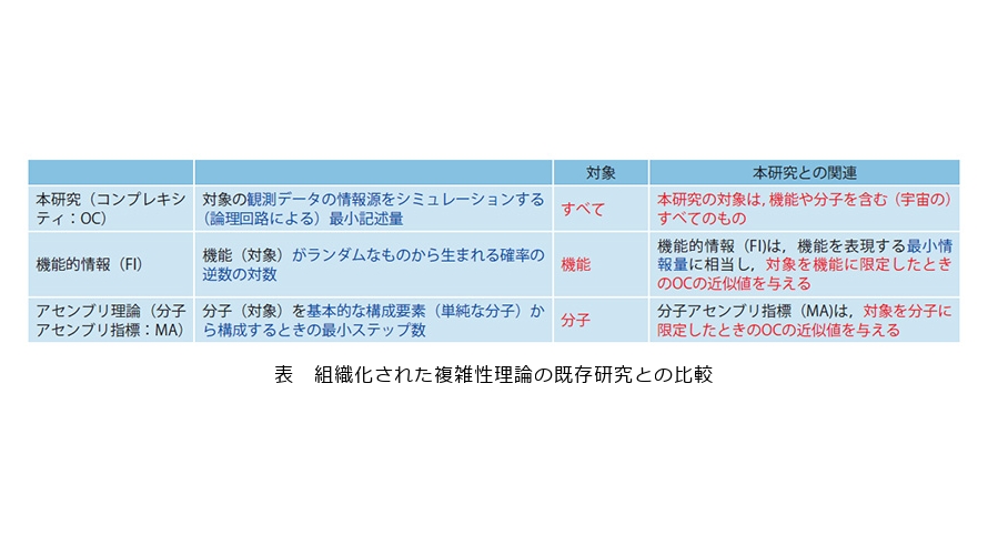 そういった意味で、観測対象を生物などの機能に限定した場合において、前述のFI(機能的情報を表す最小情報量)は私のコンプレキシティに良い近似値を与えてくれます。また、観測対象を分子とした場合、そのコンプレキシティを厳密に定めることは難しいところを、前述のMAでは単純な分子から積み上げる際の最小ステップ数で計算しており、これもコンプレキシティに良い近似値を与えてくれます。このように、コンプレキシティはあらゆる対象を網羅するように定義していますが、これら既存研究は個別の対象における近似値を与えていると考えています(表)。