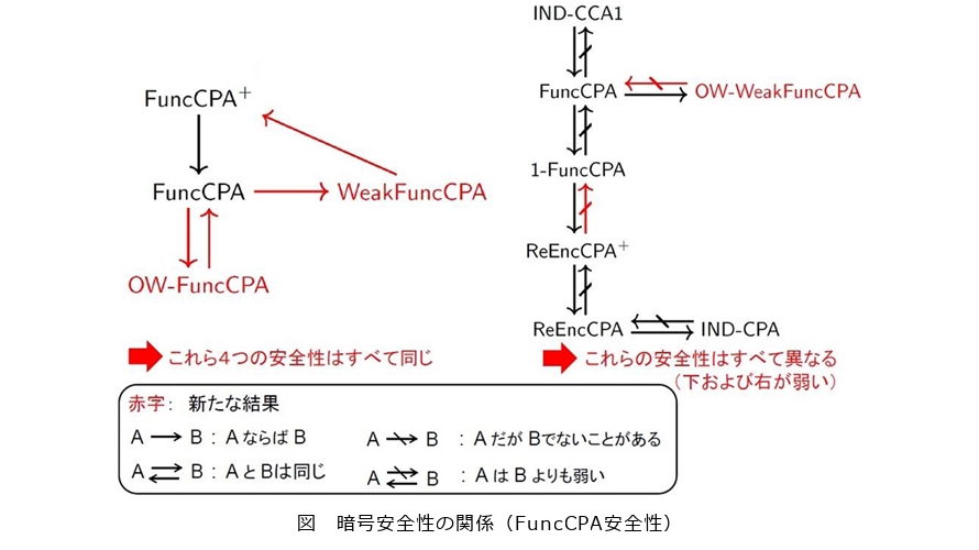 図ではFuncCPAを中心に各バリエーションの概念的な強弱レベルを示しており、下方向や右方向が弱くなります。まず図の左に、中心的な位置付けのFuncCPA、それを強めたFuncCPA+、弱めたOW-FuncCPA、そして右にはFuncCPAを弱めたWeak FuncCPAなどがあります。そこで、各バリエーション間で概念上の強弱はあっても、実際はどうなのかと赤字で記したバリエーション間の強弱について調べたところ、FuncCPAとOW-FuncCPAが等価であることや、FuncCPA→Weak FuncCPA→FuncCPA+→FuncCPAと3つのバリエーションの間を→が一周して閉じることを解明し、これら4つのバリエーションがすべて等価(同等の安全性)であることを証明しました。この結果について当初は予想しておらず私どもにとっても驚きでした。