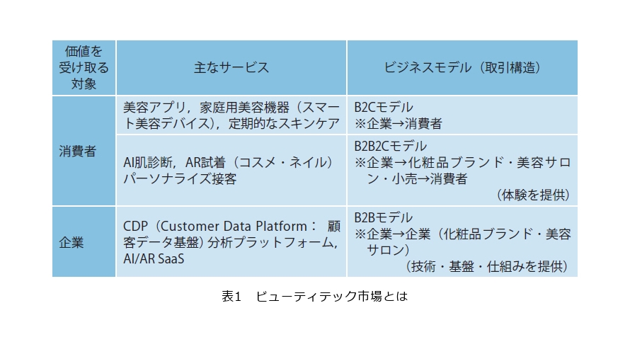 ビューティテックは、表1のとおり、具体的には、価値を受け取る対象が消費者と企業になります。