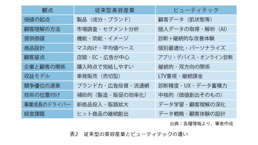 ビューティテックと従来の美容産業を比較したものが表2です。