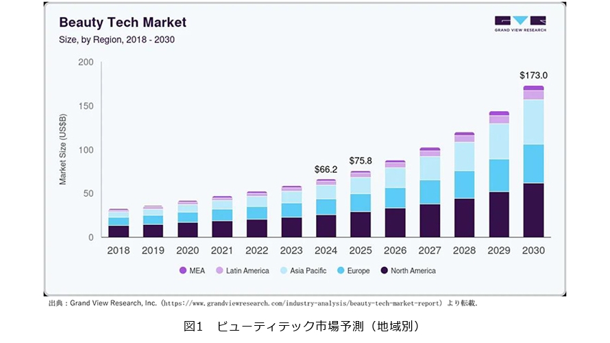 次に、市場規模やその見通しをみていきます。Grand View Research, Inc.が公表した世界のビューティテック市場の2018年から2024年までの実績値と2025年から2030年の予測を示したものが図1です。図1によると2025年から2030年の年平均成長率は17.9%の成長が見込まれており、化粧品市場全体の成長率を大きく上回っています。