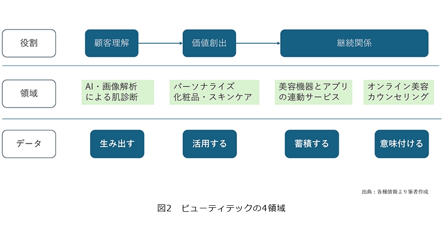 特に図2に記載の4領域(①AI・画像解析による肌診断、②パーソナライズ化粧品・スキンケア、③美容機器とアプリの連動サービス、④オンライン美容カウンセリング)が成長を牽引しています。