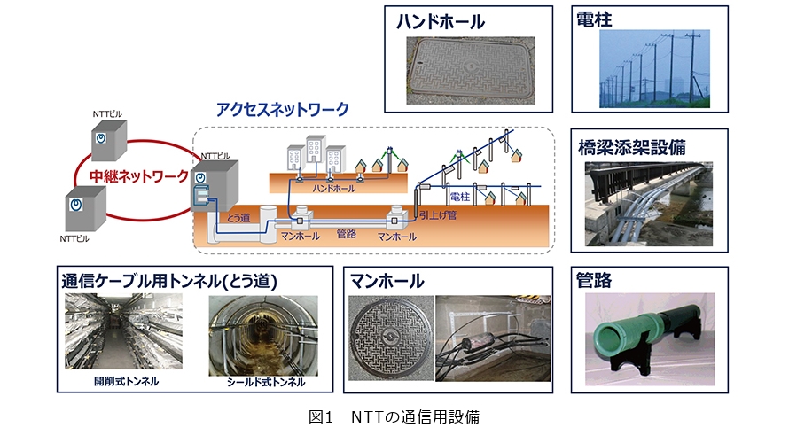 NTTの通信用設備の外観を図1に示します。通信網におけるアクセスネットワークとは、各利用者の端末や建物と通信事業者のビルとをつなぎ、通信サービスを提供する通信網のことで、シビルシステムプロジェクトではとう道、マンホール、管路、橋梁添架設備の研究開発を行ってきました。1970~1980年代の研究開発では、物品開発や開削を中心とした施工技術が主な対象でしたが、阪神・淡路大震災を契機として耐震機能の向上および耐震性確保の必要性に関する研究へと重点を移し、さらに近年では、老朽化が進行する設備を対象に、効率的かつ持続的な保守・管理手法の研究へと重点対象を移しています(1)。