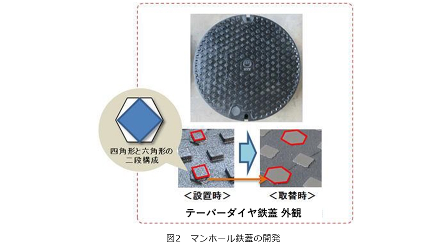 MHの鉄蓋は地下に設置された通信・インフラ設備へのアクセス機能を担うと同時に、地上露出部でもあり、交通荷重や第三者影響から設備と人の安全を確保する重要な構造要素として位置付けられます。「テーパーダイヤ鉄蓋」は、点検しやすく、かつ耐摩耗性に優れた鉄蓋として改良開発された物品の一例です(2)。図2に外観と改良点を示します。異なる形状(四角形と六角形)の二段構成を持つ模様とする工夫が適用されています。これは摩耗の進行によって、四角形から六角形へと変化する構造とすることで、残存する溝を計測せずとも、模様形状の変化を目視するだけで摩耗状態を把握可能となり、カメラ画像による点検を容易にするなど、維持管理業務の簡易化および迅速化を実現しました。さらには、模様の配置を工夫することにより、摩耗原因となる砂などを効率的に排出して蓋自身の耐摩耗性を高め、取り換えまでの期間を改良前の約3倍へと延伸することができました。これらの研究開発は、物品や構築コストだけではなく、維持管理コストまで見据えた設計によるものであり、またMH鉄蓋においては摩耗が発生する際のメカニズムを分析して新規開発にフィードバックすることで、長期に管理可能な通信基盤設備を強化していくものです。