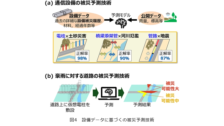 図4に被災予測技術の概要を示します(5)。長年にわたり蓄積してきた設備被災時の点検データを用いることで、例えば電柱を対象として豪雨起因の被災リスクを評価すると、高精度(正答率約98%)で推定するAIモデルの構築に成功しました(図4(a))。さらに、この技術を応用し、地図上に仮想的に配置した電柱データを用いて道路沿線の被災リスクを面的に評価する手法にも応用を展開しています(図4(b))。本手法により、詳細な現地調査や道路固有のデータがなくても、全国どこでも短時間で豪雨時の道路被災リスクを推定し、ハザードマップが整備されていない地域においても、迅速な被災リスクを評価できます。こうした設備単位の被災予測技術を応用するかたちが、道路の被災リスクを面として評価する技術の一例です。本技術は道路の避難ルートや物流ルートの検討、事前防災計画の策定など、地域の防災・減災や復旧計画の構築に資するものと期待されます。