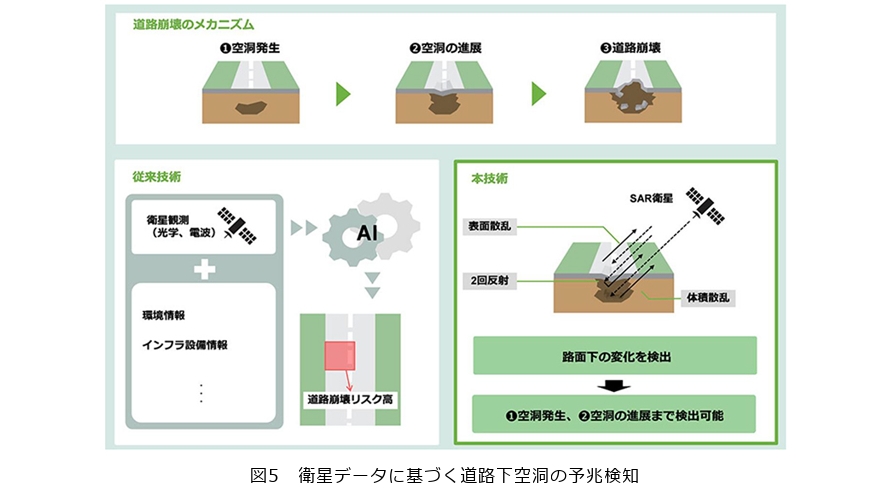 社会インフラを対象とした維持管理は、設備単位の評価に加え、広域に状況を把握する視点が重要となります。その有力な手段の1つが、衛星データを活用した広域観測です。本技術の概要を図5に示します。一般に、SAR(Synthetic Aperture Radar)*2衛星を用いたインフラ監視では、地表面の凹凸や沈下といった形状変化をとらえる手法が用いられてきました。これに対し、NTTでは地表面に現れる変状だけを対象とするのではなく、アスファルトへの浸透性を有する電波の散乱特性や偏波成分に着目することで、地表に顕在化する前段階の地盤内部の変化をとらえる手法を実証しました(6)。また、衛星データを時系列で取得し変化を分析することで、空洞変状の進展状況を把握することが可能となります。これにより、道路陥没の予兆を、地表変状が顕在化する以前の段階からとらえることができると考えます。従来の地中空洞は道路上から地中レーダを用いて現地点検することで特定していましたが、本技術を適用することで、広域を対象とした効率的なスクリーニングが可能となり、点検に要するコストや稼働を大幅に削減できると期待されます。