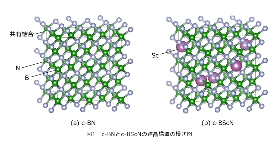 ホウ素(B)と窒素(N)は、周期表上で炭素(C)の両隣に位置する元素です。炭素原子は、原子どうしが強い共有結合をつくることで、極めて硬い結晶であるダイヤモンドになります。同様に、BとNも共有結合を形成し、ダイヤモンドと同じ立方晶構造*1(図1(a))をとります。このときにできる材料が、立方晶窒化ホウ素(c-BN:cubic Boron Nitride)です。