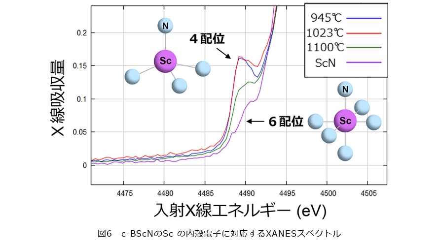 図6に示すように、Scの内殻電子に対応するXANESスペクトルを測定したところ、4490 eV付近に特徴的なピークが確認されました。このピークは、Sc原子が4配位構造をとる場合に現れることが知られており、Scが岩塩構造を持つScNのような6配位構造とは異なる結合状態にあることを示しています。さらに、Sc原子がc-BScN結晶中のどの位置に取り込まれているのかをより詳しく理解するために、第一原理計算を用いた解析も行いました。第一原理計算とは、実験データに頼ることなく、量子力学に基づいた物理法則から、原子や電子の振る舞いを計算する理論手法です。この計算を用いることで、「どの原子位置に入るとエネルギー的に安定か」や、「どのような結合状態をとるか」を理論的に予測することができます。本研究では、Sc原子がc-BScN結晶中でN原子の位置に置換した場合と、B原子の位置に置換した場合について、それぞれXAFSスペクトルのシミュレーションを行いました。その結果、Sc原子がN原子の位置にあると仮定した場合のシミュレーションでは、ピークの強度やエネルギー位置が実験結果と大きく異なるのに対し、Sc原子がB原子の位置にあると仮定した場合では、実験結果と近い特徴的なピーク形状が見られました。これらの実験結果と理論計算を総合すると、c-BScN薄膜中のSc原子は、閃亜鉛鉱構造の結晶格子中でB原子の位置を置換して取り込まれていることが示唆されます。本研究で得られたこうした知見は、c-BScNに限らず、他のc-BN 系三元混晶材料を探索する際にも有効です。準安定相材料において、異種元素を結晶格子中へ安定に取り込むための条件設計は、新材料探索を進めるうえで重要な指針となります。