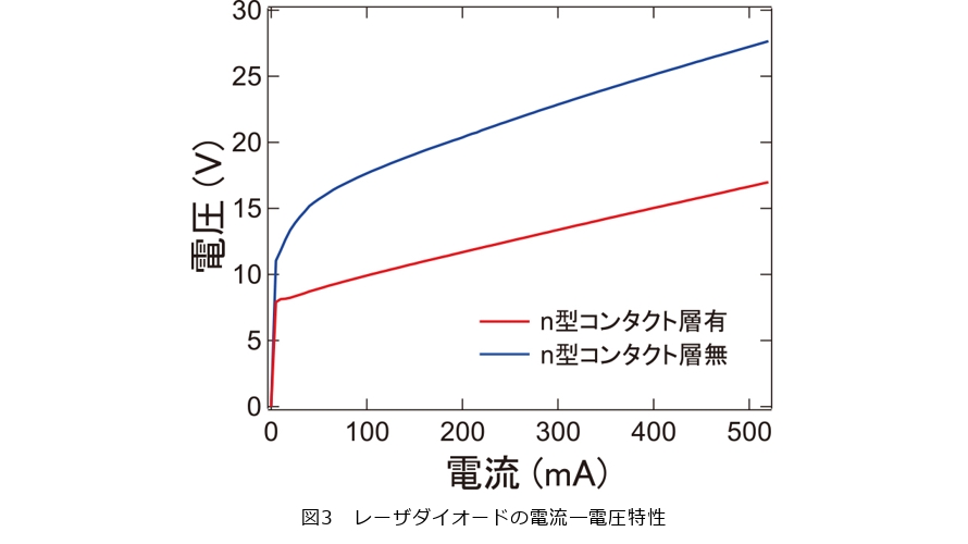 図3は、本研究のn型コンタクト層を形成したレーザダイオード(図2(b))と、同層を形成していない従来構造のレーザダイオード(図2(a))について、電流-電圧特性を比較した結果を示しています。n型コンタクト層を導入したデバイスのほうが、同一電流条件における動作電圧が低く、すなわち素子抵抗が低いことが分かります。これは、n型コンタクト層を導入することで、電極とn型クラッド層との間のエネルギー障壁が低下し、オーミック接触抵抗が低減されたためです。一方、n型コンタクト層を導入していないデバイスでは、電極と半導体界面における非オーミック(ショットキー的)接触特性に起因する抵抗が、動作電圧の増加に影響していることが分かります。以上より、n型コンタクト層を用いた形成技術は、非オーミック接触に起因する電圧上昇の抑制に寄与し、デバイスの低消費電力化に有効であることを示しています。