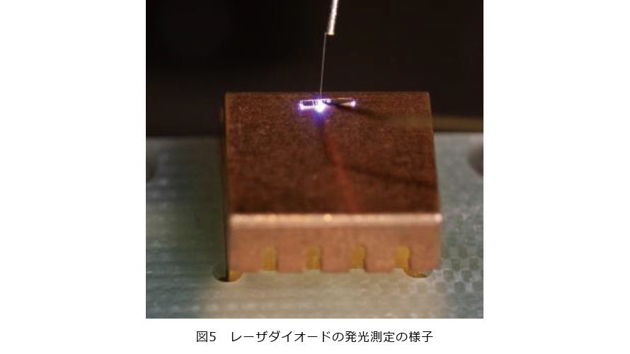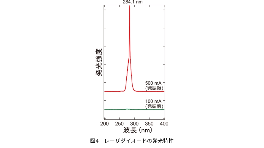図4は、本研究のn型コンタクト層を形成したレーザダイオードについて、室温・パルス電流注入条件下で測定した発光スペクトルを示しています。注入電流の増加に伴い、深紫外域に発光ピークが現れ、高電流領域では284.1nm付近に鋭いピークが観測されました。低電流領域では自然放出光が支配的な広いスペクトルを示しますが、電流増加に伴って特定の波長成分が急激に強まり、スペクトル幅が著しく狭くなることが確認されます。この挙動は、共振器内での光増幅が進み、誘導放出*6が支配的な状態へ移行したことを示しています。図5は、本研究で作製した深紫外レーザダイオードが実際に動作している様子を示した写真です。通電するとデバイス端面から発光していることが確認できます。これらの結果は、n型コンタクト層の導入によって電子注入効率が向上し、図3で示した動作電圧低減の効果が光学特性にも反映されていることを示しています。以上のことから、n型コンタクト層の最適化が、深紫外レーザダイオードにおいて安定したレーザ発振を実現するうえで重要であることが分かります。