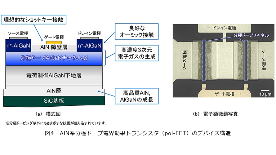 図4に分極ドープAlGaNをチャネル層としたAlN系pol-FETのデバイス構造の模式図と、その電子顕微鏡像を示します。デバイス構造は炭化ケイ素(SiC)基板上に有機金属気相成長法(MOVPE法)*5により成長させました。