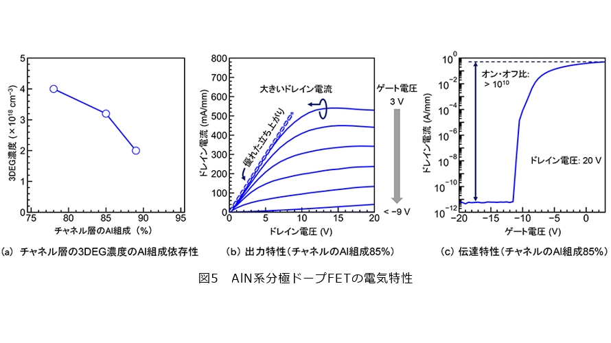 図5(b)に作製したAlN系pol-FET(チャネルのAl組成85%)の電流―電圧特性(出力特性)を示します。これらの技術により、高Al組成85%のAlGaNチャネルにおいても、線形性の優れた電流の立ち上がりと、500 mA/mmを超える大きなドレイン電流を実現しました。一方、トランジスタは大電流を流すだけでなく、ゲート電圧により、それをオフすることも求められます。作製したAlN系pol-FETは図5(c)に示すように漏れ電流のない良好な伝達特性を示しており、1010を超えるオン・オフ比を得られています。この高いオン・オフ比はトランジスタをより高い周波数で動作させられる1つの指標となります。