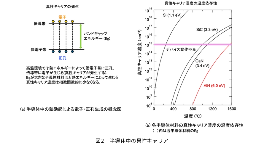 図2に示すように、Siでは200 ℃程度で真性キャリア濃度が1×1015cm−3を超え、デバイス動作が困難になります。これに対し、AlNは 1400 ℃においても真性キャリア濃度は1×1015cm−3以下であることから、従来材料では理論的に困難であった極めて高温でのデバイス動作が可能であることが予測されています。さらに、AlNは高温でも酸化や劣化が起こりにくい高い化学安定性を持っています。このため、極めて過酷な温度環境においても材料特性が変化しにくく、高温でも安定に動作できる半導体材料として期待できます。