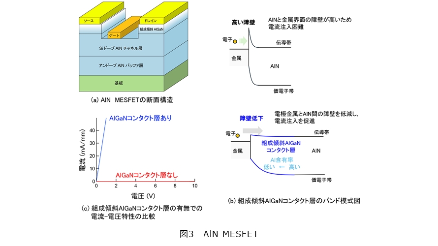AlNを用いた電界効果トランジスタ開発における大きな課題の1つは、AlNチャネル層とソース電極およびドレイン電極との間に低抵抗な電気的接触を形成することが難しい点です(図3(a))。AlNはEgが大きく、電極金属との界面に高いエネルギー障壁が形成されるため、電極金属からAlNに電流を効率良く注入することが困難です。このため、良好なオーミック接触*6を実現することが、AlNデバイス開発における重要な技術課題となっていました。