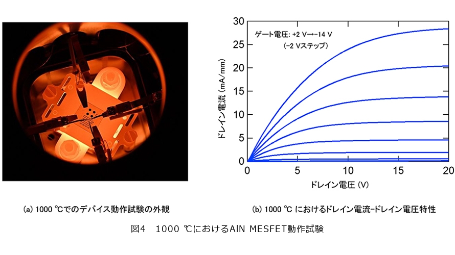 図4(a)は、1000 ℃においてAlN MESFETを評価している様子を示しています。加熱炉内にデバイスを形成したウエハを設置し、高温環境下でMESFETの電極に直接プローブを接触させることで、ドレイン電流やゲート電流をその場で測定しています。このような極めて高温な条件下での評価は、測定系の構築自体が難しく、従来の半導体デバイスではほとんど行われてきませんでした。