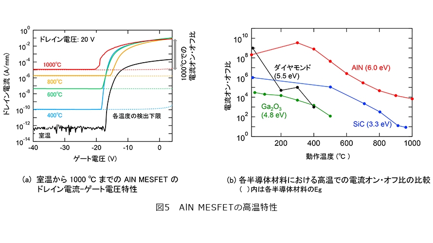 もう1つの重要な特長は、高温環境においてもトランジスタのオフ状態のドレイン電極―ソース電極間のリーク電流が低く抑えられ、明確な電流オン・オフ動作が維持される点です。図5(a)に示すように、温度の上昇に伴ってリーク電流は増加するものの、1000 ℃においてもトランジスタのオン状態とオフ状態のドレイン電流の比(電流オン・オフ比*8)がおよそ104と十分に大きいことが確認されました。高温環境では、半導体内部で熱によって不要な電流が流れやすくなり、多くの材料では電流オン・オフ比が大きく低下します。これまでに、ダイヤモンド(Eg: 5.5 eV)、酸化ガリウム(Ga₂O₃)(Eg: 4.8 eV)、SiC (Eg: 3.3 eV)などの材料を用いた半導体デバイスの高温動作が報告されていますが、高温下ではリーク電流の増加により電流オン・オフ比が低下する傾向が知られています。これに対し、AlN MESFETは高温においてもリーク電流の増加が比較的緩やかであり、図5(b)に示すように、他の半導体材料と比較して、高温側まで高い電流オン・オフ比を維持していることが分かります。なお、高温測定では測定系由来のバックグラウンド電流が増加し、高温領域では、トランジスタ自体のリーク電流ではなく、測定装置のバックグラウンド電流が観測されています。このことから、実際のAlN MESFETの電流オン・オフ比は、図に示された値よりもさらに大きいと考えられます。以上の結果から、AlNは半導体の中で最高の高温デバイス特性を実際に持つことを実証しました。