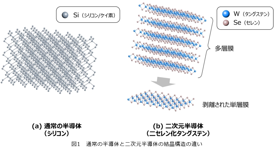私たちが普段使っているPCやスマートフォンの内部では、情報処理や無線通信のためにシリコンやガリウムヒ素といった半導体材料が使われています。これらの半導体は、原子どうしが共有結合によって三次元方向に規則正しく結びついて結晶を構成しています(図1(a))。これに対して近年大きな注目を集めているのが、原子が面内方向にのみ結合した二次元層状物質と呼ばれる材料で、その中でも半導体の性質を持つものが二次元半導体です(図1(b))。これらの物質は通常、多数の層が積み重なった構造になっていますが、お菓子のパイ生地のように層と層は簡単に剥がれます。理論的には、こうした層状物質を究極的に薄い「単層」にすることで、三次元の結晶では現れない新しい物理現象を生じることが以前から予想されていましたが、単層のみを実際に取り出すことは長らく困難でした。その状況を大きく変えたのが、2004年に、のちにノーベル賞を受賞することになる研究者らによって報告された、層状物質であるグラファイトから単層のグラフェンを剥離する手法です。この発見を契機に、二次元半導体を含む二次元物質の研究が爆発的に発展しました。