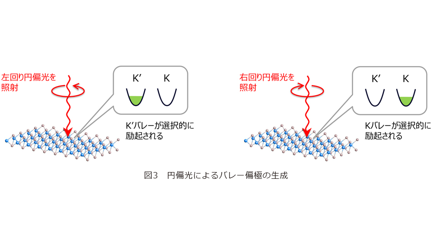 二次元半導体の特に重要な特徴の1つが、バレーが光の円偏光と強く結びついている点です。図3に示すように、右回り・左回りの円偏光を使い分けることで、特定のバレー状態を選択的に生成し、観測することが可能になります。このように、光を介してバレーを直接操作できることは、従来の半導体にはない大きな特徴です。