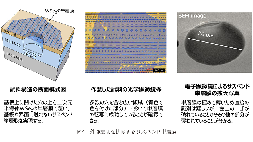具体的には図4左に示すように、シリコン基板の上にチタンと金の薄膜を形成し、その上にさまざまなサイズの穴(例えば直径10μm、深さ0.8μm)を加工します。この基板の上を二次元半導体であるWSe2(二セレン化タングステン)の単層膜で覆います(4)。単層膜は大変デリケートであるため、大面積でかつ穴を覆う状態の単層膜をつくる技術自体が大変難しく、クリーンルーム内で試行錯誤を重ねることでようやく実現することができました。図4中央と右は、作製したサスペンド単層膜の光学顕微鏡像および電子顕微鏡像です。