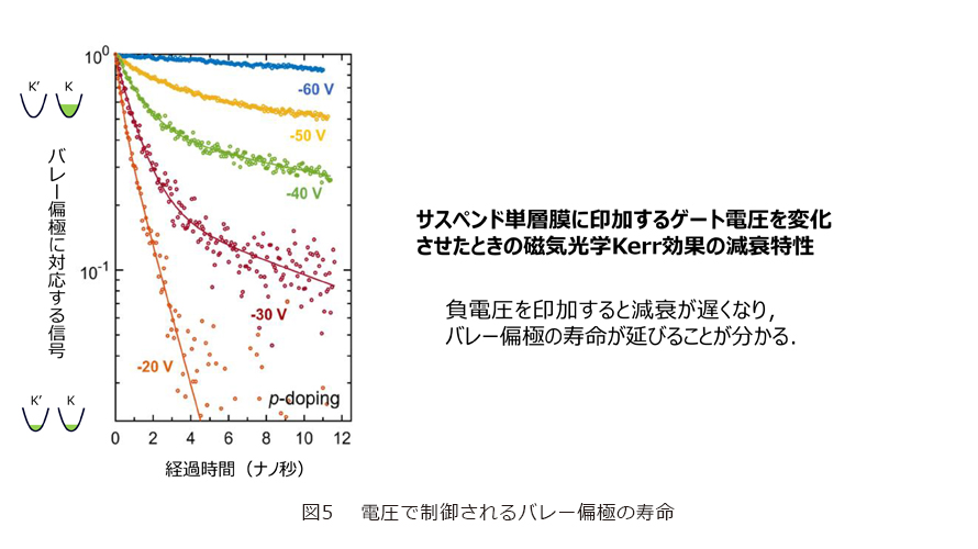さらに、サスペンド単層膜に加える電圧を変化させることで、バレーの偏極効果をどの程度持続させられるかを調べる実験を行いました。ゲート電圧‒20V(ボルト)では、偏極状態はすぐに解消されますが、‒60Vであれば偏極効果がより長時間維持できるということが分かりました(図5)。これらの結果は、バレーの自由度を活用した新たなデバイス応用の可能性を広げる発見だと考えています。