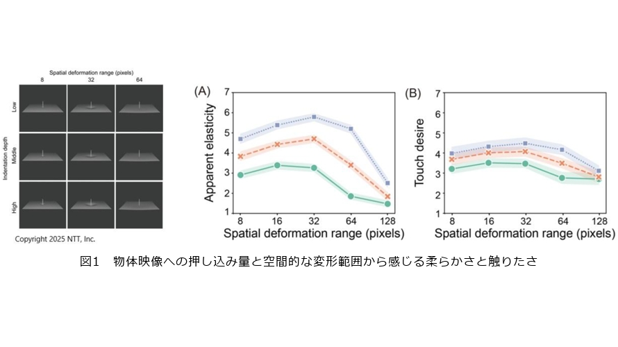 実験参加者にこの映像を見てもらい、「柔らかさ」や「触りたさ」の感触について質問した結果を図1のグラフに示します。2つのグラフの横軸は共に「空間的な変形の範囲」で、グラフ(A)の縦軸が「見た目の柔らかさ」、グラフ(B)が「触りたさ」を表しています。グラフ中の各プロットでは押し込み量を変化させており、緑色<橙色<青色の順に大きくなっていきます。 (A)、(B)の全体的なグラフ形状は類似しており、人間が柔らかいと感じることと、触りたいと感じることには明確に相関があると判断できます。また、両グラフにおいて、大きく押し込んでいる青色ではもっとも柔らかさや触りたさを感じ、小さく押し込んでいる緑色では、柔らかさや触りたさをあまり感じない結果となりました。さらに、押し込み量には依存せず、空間的変形の範囲が中程度において、もっとも柔らかく、かつ触りたく感じることも明らかになりました。 今までの研究では、押し込み量が柔らかさや触りたさに影響することは分かっていましたが、空間的な変形の範囲が影響していることは、今回の研究で初めて実証されました。従来は、対象の柔らかさを遠隔へ伝えるとき、押し込み量だけで表現されていたため、この感触を伝える手段の少なさが課題でした。しかし、今回、横方向への変形範囲も柔らかさや触りたさを伝えるパラメータになることを見出し、表現する引き出しの数を増やすことができました。 このような視覚的質感の研究について、ビューティテックを志向する資生堂社に説明する機会があり、例えば化粧品の質感や肌触りを視覚情報として伝えることはできないものかと2025年9月から共同研究を開始しています(1)。例えば拡張現実なども視野に入れ、商品の映像だけでは難しい質感についても伝えられるのではないかと検討しています。現在はNTTの技術を資生堂社でテストしていただいている状況で、今後、皆さんへも発表できる機会があるのではないかと思っています。