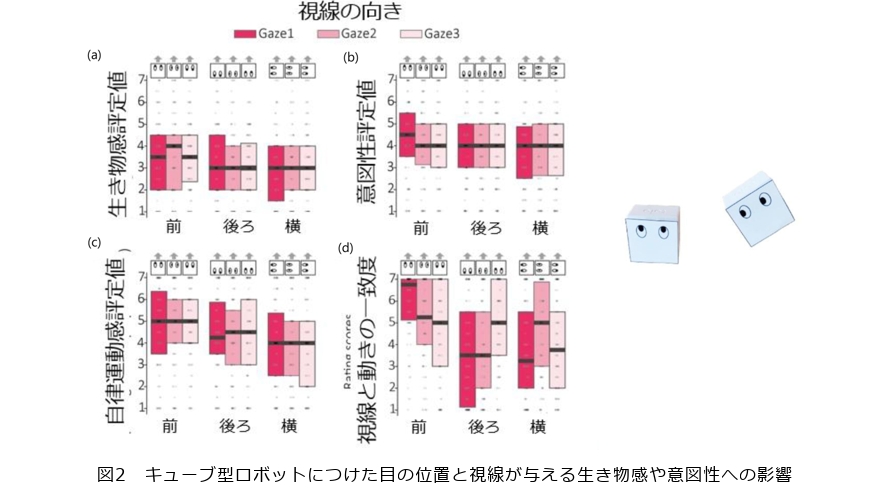 具体的には、二次元平面上を自由に動くことのできるキューブ型ロボット(箱型ロボット)のどこに目をつけたら、目線をどの向きにつけ描いたら生物らしく見えるのかについて研究をしています。結論は「目は動く方向の前方」についていると生き物らしさが発現する、または自立的に動いている印象を受けるというものでした。興味深いのは、その目の位置は重要であるが、視線の方向はあまり影響を及ぼしていないという事実でした(図2)。