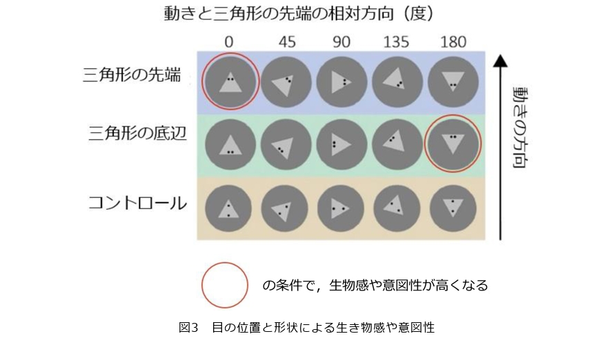 図3は三角形が自由に動きまわる映像を作成し、その映像の生き物感度を評価させた実験ですが、その際、三角形の頂点が動く方向に合っている、つまり、頂点を先頭に三角形が自由に動き回ると生き物っぽさを感じるということが分かりました。一方で、三角形の頂点が動きの方向とずれている場合は、水や風に流されてしまっているように見える。つまり、生き物が動いているのではなく物体が流されているように見えるという評価になりました。そして、三角形に目をつけた場合にどうなるかと実験したところ、たとえ頂点の向きと動く方向が合っていても、目がその動きの前方にあるほうが生き物らしく見えているということが分かりました。