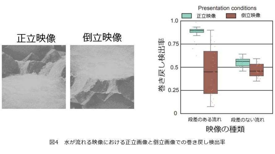 例えば、川(液体)が流れている映像について、正立映像と上下反転させた倒立映像を作成し、視聴者に4秒間ほど見てもらいます。そして、通常どおり再生する場合と、巻き戻しをして再生する場合と2つを提示し、今見た映像はどちらの映像であったか、と質問しました。その結果、正立映像では巻き戻し動画を皆さん容易に検出することができましたが、倒立映像になると巻き戻し動画の検出率が低下したのです(図4)。