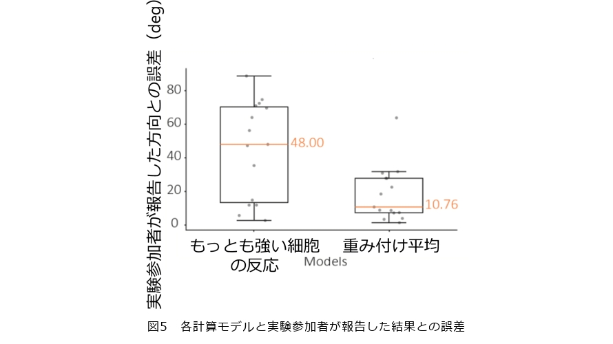 しかしこの方法を使うと、図5左に示すとおり、実験参加者が報告した方向との誤差が48degと大きくなりましたので、私たちは「重み付けして平均する」方法を採用しました。すなわち、すべての細胞の反応を考慮し、それぞれの反応の強さに重みを付け、全体として平均を取る(加重平均)方法です。実際にこの計算を実施してみると、実験参加者が報告した方向との誤差はおよそ10deg程度まで縮小し、人間の判断に近づいてきました。