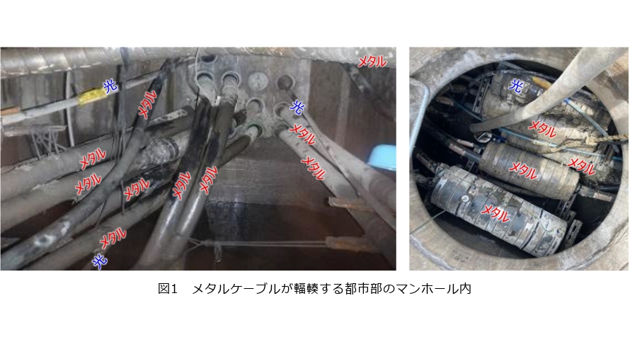 光ブロードバンド・モバイルサービスの普及・拡大を背景に、メタル設備を利用した加入電話については、利用の減少や老朽化した設備の維持限界により、2035年ごろまでにはサービスレベルの維持が困難な状況を迎えます(1)。光ブロードバンド等のさらなる普及に向けては、地下の既存管路設備を有効活用する必要があり、そのためにはメタルケーブルの撤去が必要になります。しかし、狭隘マンホール(MH)や図1に示すような都市部を中心としたケーブル輻輳個所では、従来の撤去装置の搬入や設置が困難なケースが多くみられます。また、従来撤去手法の1つであるワイヤ直掛けやチェーンによる牽引では、負荷集中によるケーブル損傷を招き、撤去不能に至る事例も確認されています。これらの課題は管路の有効活用を阻害しています。NTT東日本 技術協力センタでは、こうした状況を解消するため、狭隘MHへ搬入可能な小型・軽量設計でありながら、高荷重牽引と低加速度の荷重制御を両立した「ケーブル引き戻し装置」*1と、ケーブルを確実に把持する「撤去用把持具」を組み合わせた撤去装置を開発しました。本稿では、本装置の概要を紹介するとともに、実際の撤去困難個所における検証結果と、その成果を踏まえた全国展開に向けた取り組みについて解説します。