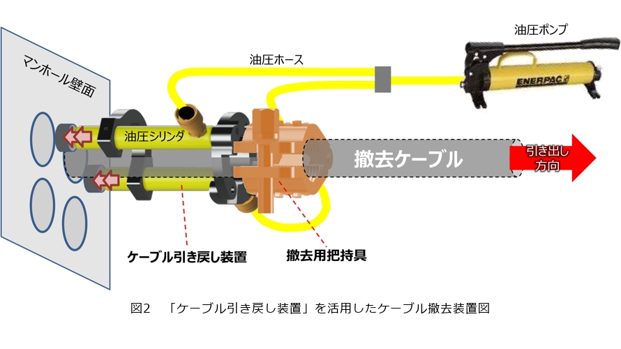*1 ケーブル引き戻し装置:道路上を走行する車両の振動に伴うクリーピングにより移動してしまった地下メタルケーブルを元の位置へ引き戻すための装置。ケーブルを把持する治具と、その側面に配置された2本の油圧シリンダ(脚部)で構成されます。油圧シリンダをMH壁面に押し付けた状態で、ケーブルを把持した治具を壁面から後退させることにより、管路内のケーブルを引き戻します。