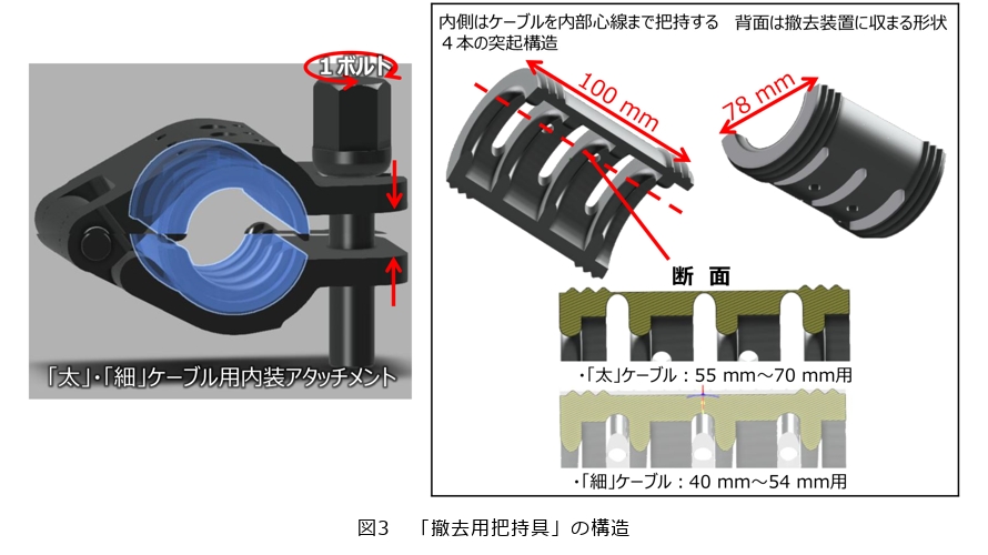 撤去用把持具の構造を図3に示します。撤去用把持具は、シンプルな構造を採用することで高荷重牽引を可能とし、さらに1本のボルトで簡単に把持・解放できるようにしています。アタッチメントを交換することで、外被を含む外径が40~70mmの幅広いケーブルに対応しています。さらに現場実証を進めていく中で、把持形状の抜本的な改良を行いました。外被の材質やケーブル外径に左右されず、円周方向からケーブル外被を加圧し、円周上に4本のくびれを形成して把持する構造へと進化させています。この改良により、従来は2t弱の負荷で外被が破断しやすかったポリエチレン(PE)外被のケーブルにおいても、4t強までの高荷重牽引に耐え、心線と外被を一体として引き出すことが可能となりました。