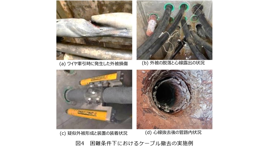 本事例は、過去の撤去試行の影響により、MH壁面から露出しているケーブル長が約11cmと極めて短く、把持具の装着自体が困難な現場です。本実証では、ケーブルが動き出すまでは、一方のMHからの「牽引」に加え、対向側のMHからの「押し込み」を併用する2台での運用を試みました。管路内の固着により、2.1tの荷重をかけた段階でPE外被が破断し始め、内部の心線だけが牽引される状況が発生しました。事例2と同様に、心線部分を補強しながら把持・牽引を繰り返すことで2.4mの引き抜きを達成しました。以降は、ユニック車による牽引へ引き継ぎ、最終的に外被を管路内に残したまま内部の心線だけを撤去しました(図4(d))。本事例では、管路内の固着による摩擦抵抗が外被の耐裂性を上回ったことから完全なケーブル撤去には至りませんでしたが、管路再利用(光ケーブルの通線など)の可能性があることを確認しました。