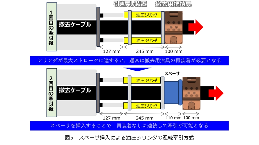 一方、管路自体の損傷が存在する場合には、撤去作業の完遂が困難となる場合もあることが明らかとなりました。また、油圧シリンダのストローク長(約127mm)を超えて引き出す場合には、その都度ケーブルから装置を取り外して再装着する必要があり、作業効率の低下が課題として明らかになりました。この課題を踏まえ、装置を脱着することなく連続的な牽引を可能とするスペーサ方式を採用しました。スペーサ挿入による油圧シリンダの連続牽引方式を図5に示します。シリンダがストローク端に達した際、①いったん圧力を解放し、シリンダを縮めたうえで、②装置と撤去用把持具の間に専用スペーサを挿入します。その後、③シリンダを再伸長させるだけで引き続き牽引が可能となります。この「①解放・②挿入・③再加圧」のサイクルを繰り返すことで、初動から連続牽引までの工程を効率化し、作業時間の短縮と作業者の負担軽減を両立させています。